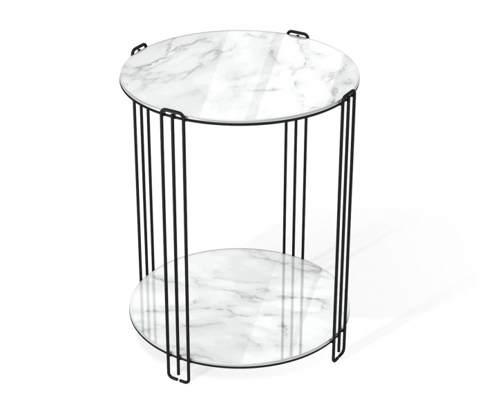 Столешницы из стекла смотрятся невесомо, благодаря толщине 5 мм. Декоративный рисунок имитирует натуральную текстуру мрамора. Продуманный дизайн ножек делает столик визуально легким и невесомым.